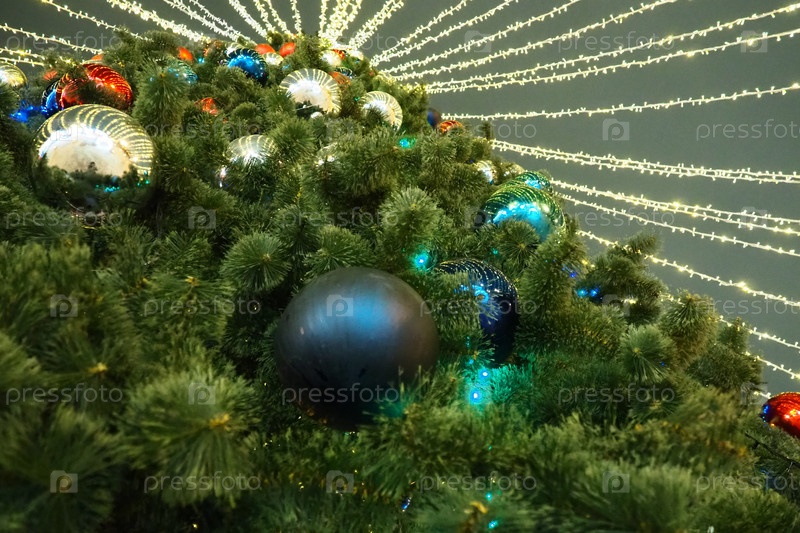 Разноцветные стеклянные блестящие шары на новогодней городской елке. Над елкой висят светящиеся гирлянды. Уличное зимнее украшение. Праздничное оформление городской площади. Красный, синий и желтый шар