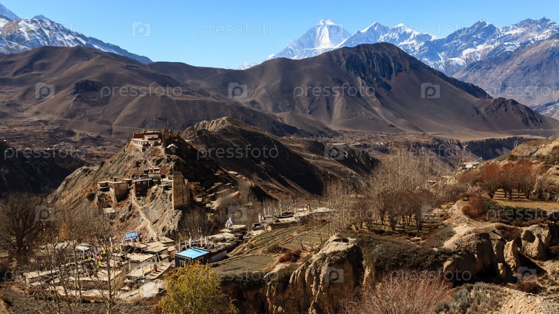 Азиатская горная деревня и террасные поля осенью в Нижнем Мустанге, Непале, Гималаях, заповеднике Аннапурны