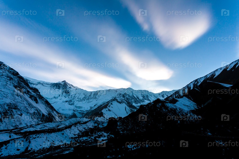 Туманный горный закат. Облака вечером над горами. Синий фон путешествия
