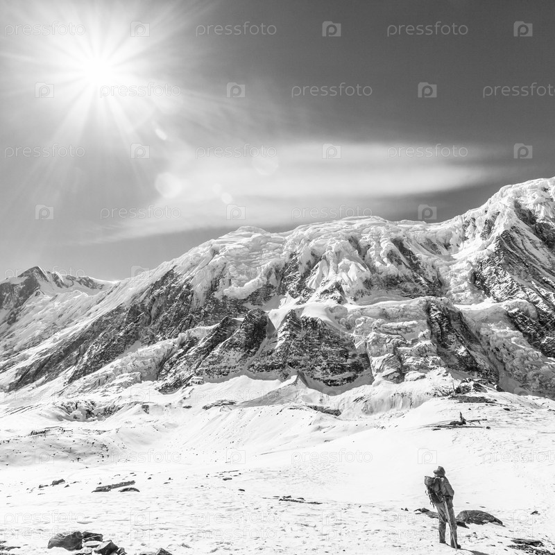 Турист фотографирует Гималайские горы возле озера Тиличо (4920 м), заповедник Аннапурна, Непал