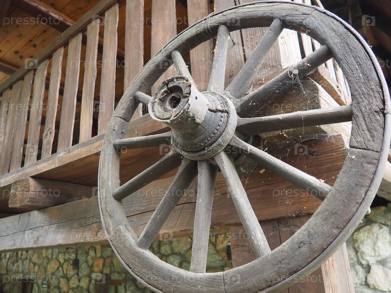 Колесо — это движитель, диск, который свободно вращается или закреплен на вращающейся оси, позволяя помещенному на него телу катиться, а не скользить. Деревянное колесо от колесницы или повозки, этнодеревня Станишичи