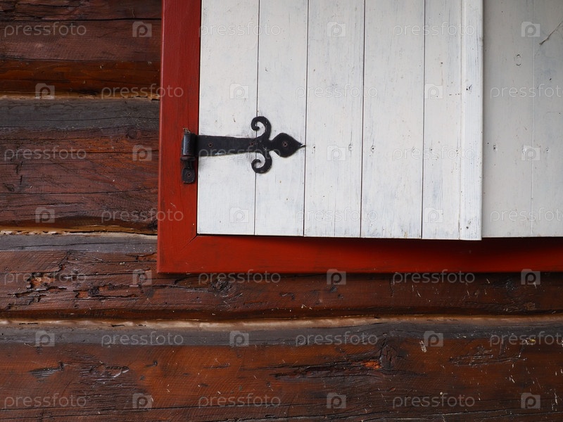 Этно-народные деревянные ставни на окне с деревянной рамой, выкрашенные в красный и белый цвета. Металлическая скоба-петля в виде стрелы и сердечка. Архитектурный комплекс Станишичи, Белина, Босния. Бревенчатый домик