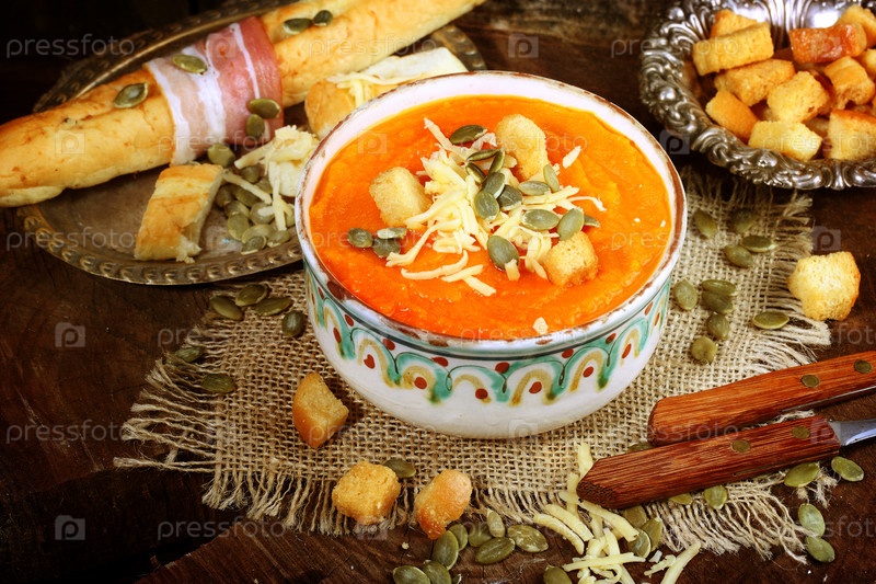 Суп-пюре из тыквы с крекерами, багетом и ветчиной на деревянном столе