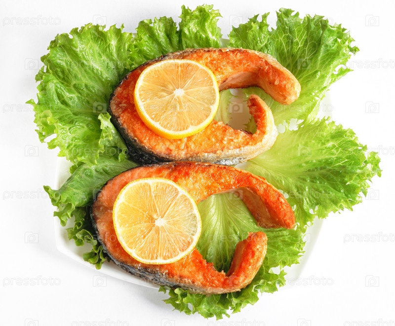Жареный лосось с лимоном на белой тарелке