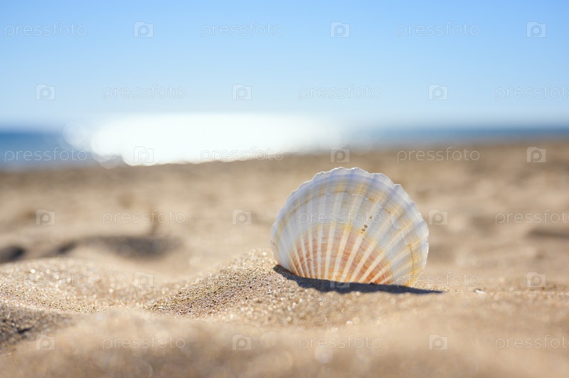 Большая белая ракушка на морском берегу. Морской летний пейзаж