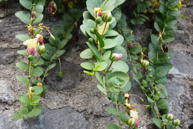 Capparis spinosa, куст каперса, роза Флиндерса представляет собой многолетнее растение с округлыми мясистыми листьями и большими цветами от белого до розово-белого цвета