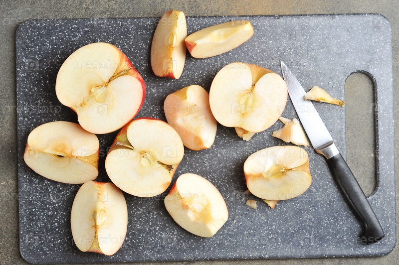 Нарезанные красные яблоки на доске ножом