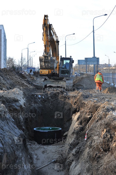 Экскаватор роет траншею для прокладки кабеля в Санкт-Петербурге