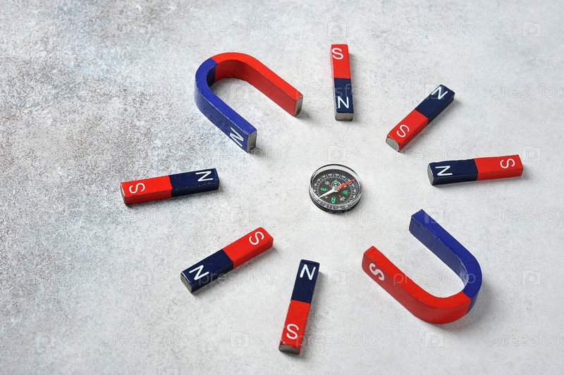 Компас лежит между разными магнитами - концепция проблемы