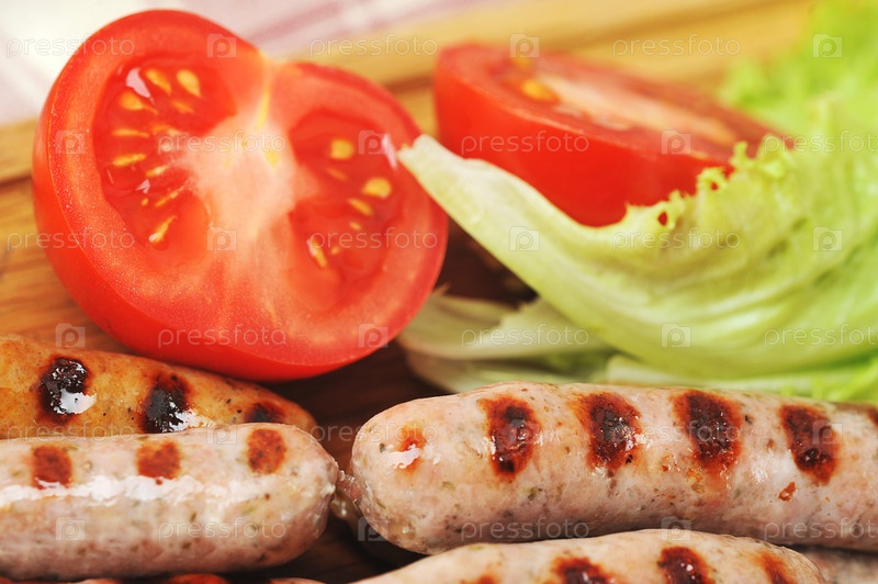 Копченые колбаски гриль, листья салата, помидоры
