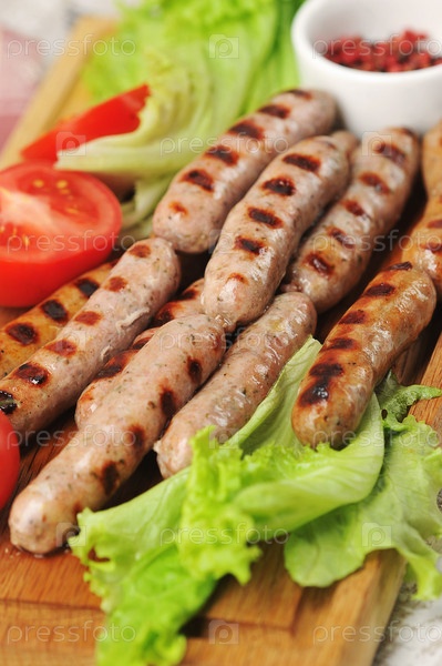 Копченые колбаски гриль, листья салата, помидоры