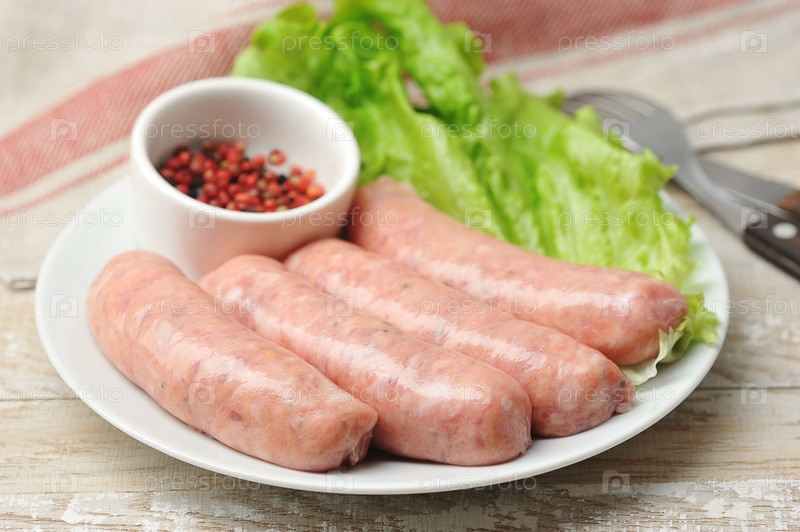 Сырые купаты на тарелке с салатом и перцем