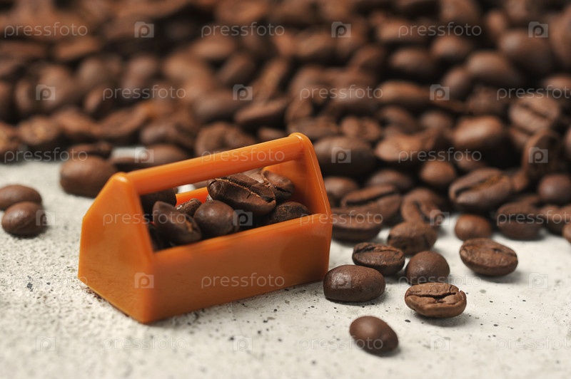 Кофейные зерна в игрушечном ящике для инструментов на фоне кофейных зерен