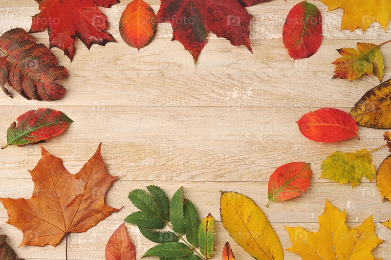 Осенние разноцветные листья на деревянном фоне