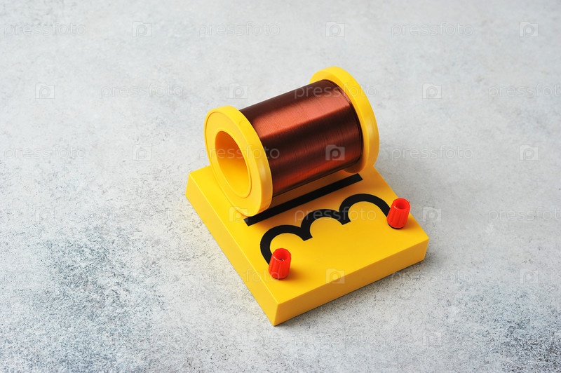 Индукционная катушка на желтой подставке — оборудование для урока физики