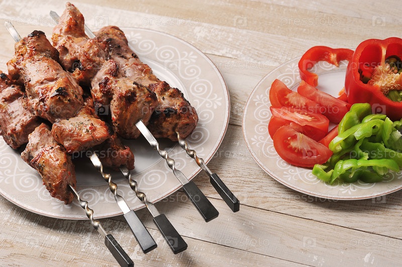 Свиные шашлычки на шампурах в тарелке на деревянном фоне