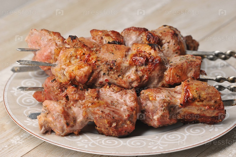 Свиные шашлычки на шампурах в тарелке на деревянном фоне