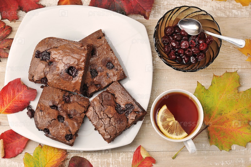 Кусочки пирожного с вишней и чашкой чая на деревянном фоне