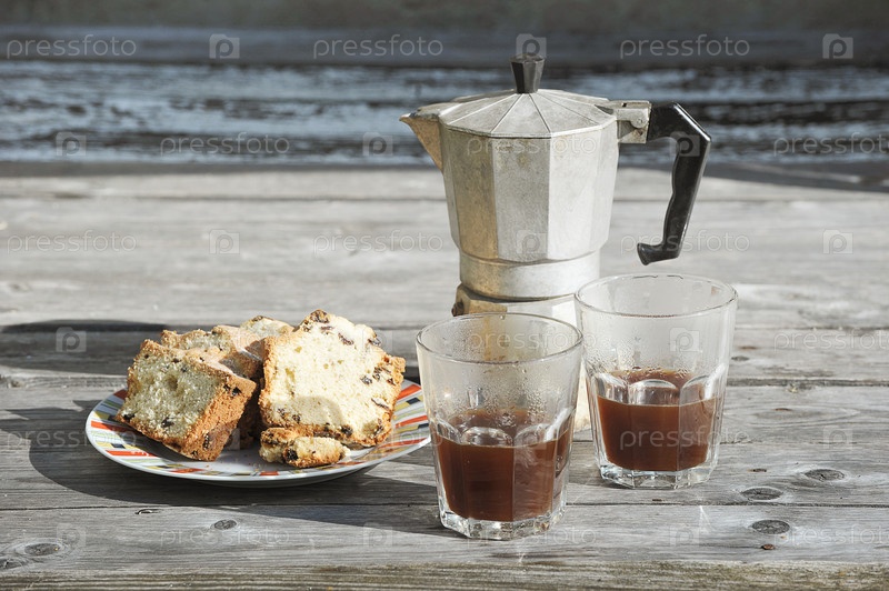 Утренний кофе - кофейник и два стакана кофе с тортом