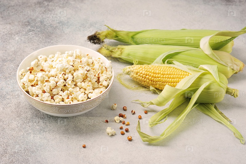 Колосья кукурузы и приготовленный попкорн в миске на сером фоне