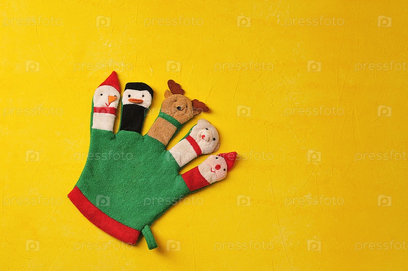 Рождественская кукла в перчатке на желтом фоне, вид сверху