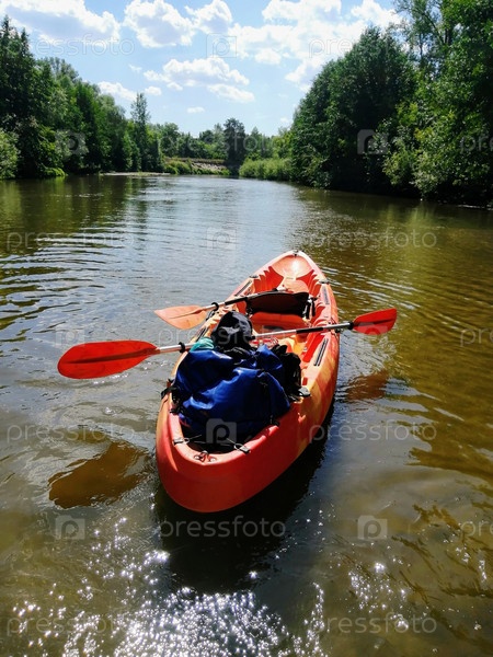 Каяк на середине чистой реки в бликах солнца жарким днем