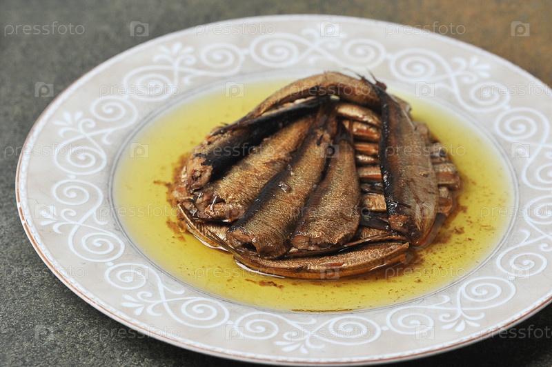 Шпроты в масле в тарелке на сером