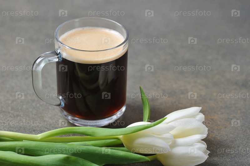 Чашка кофе и белые тюльпаны