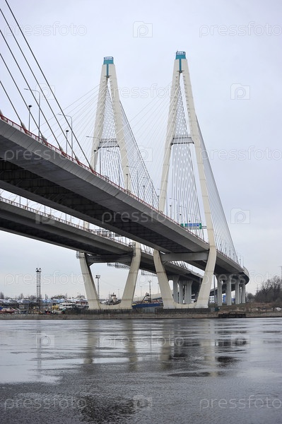 Вид на вантовый Обуховский мост с набережной Невы