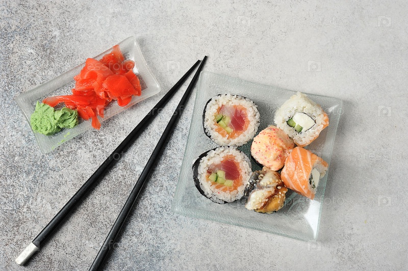 Суши-сет с палочками для еды на сером фоне