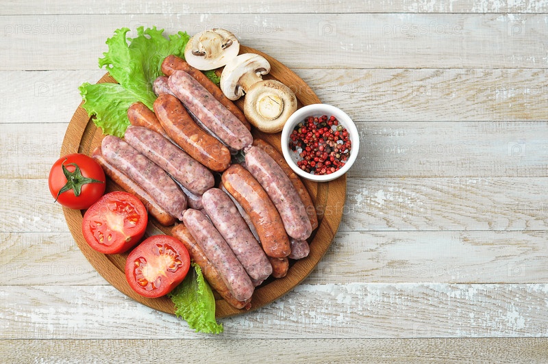 Сырые колбаски-гриль на деревянной круглой доске с помидорами и грибами