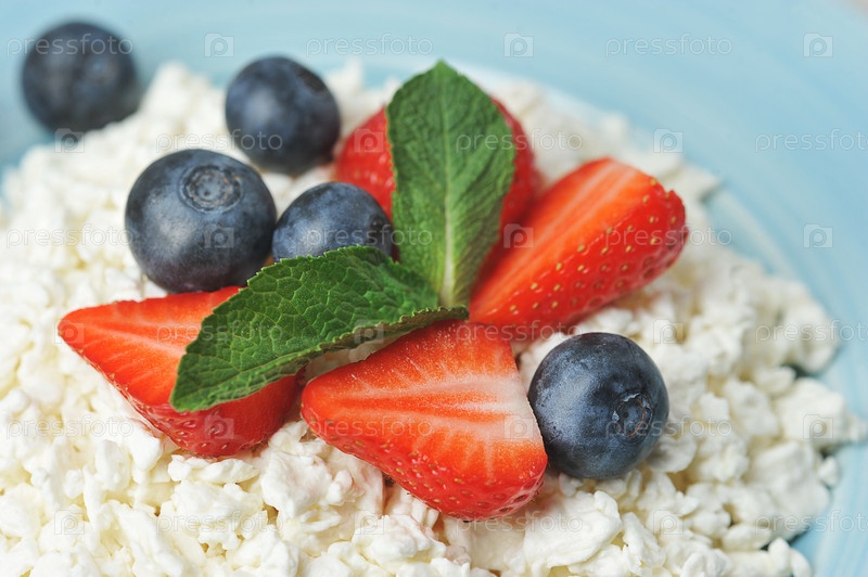 Творог и ягоды - черника, клубника и мята с творогом
