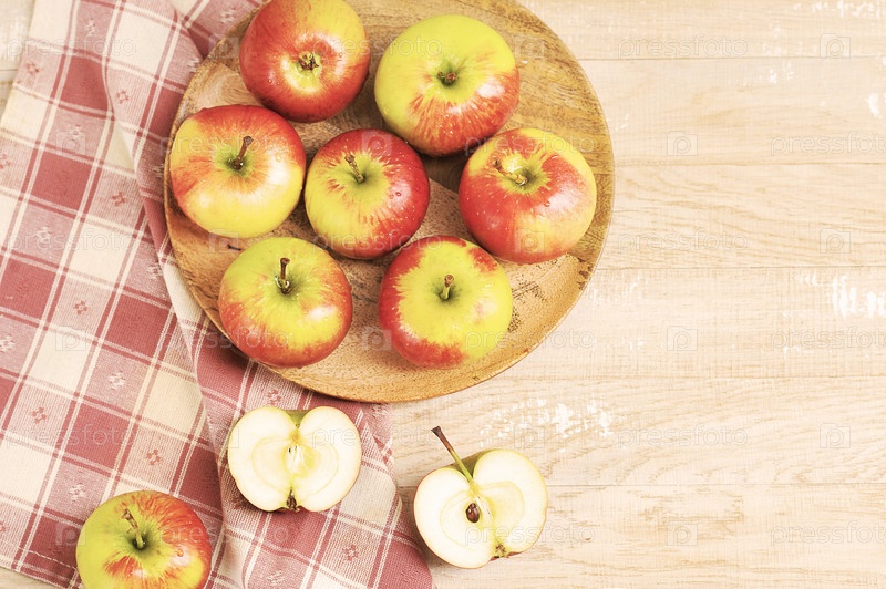 Спелые красные яблоки на деревянной тарелке