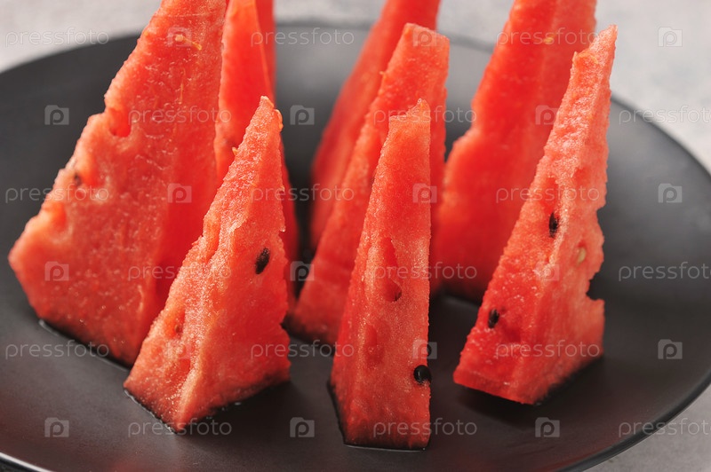 Арбуз, разрезанный на кусочки, на черной тарелке
