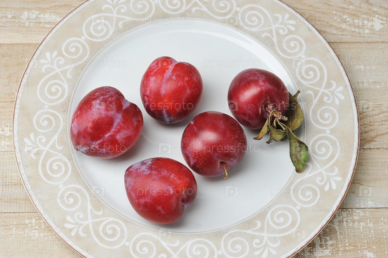 Красные сливы на тарелке на деревянном фоне