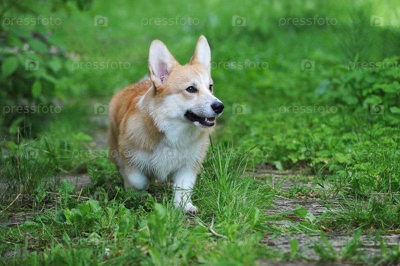 Валлийский корги пемброк гуляет по зеленой траве