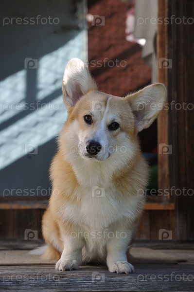 Валлийский корги пемброк сидит на деревянном крыльце дома