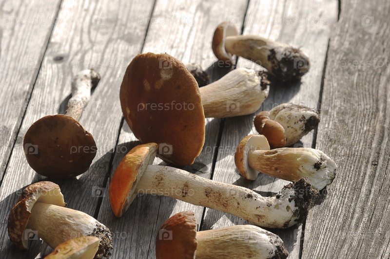 Грибы на деревянном фоне - вид сверху - съедобные грибы - белые, подосиновики, подосиновики