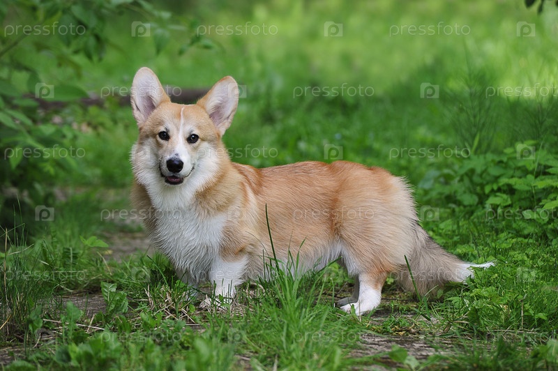Валлийский корги пемброк гуляет по зеленой траве