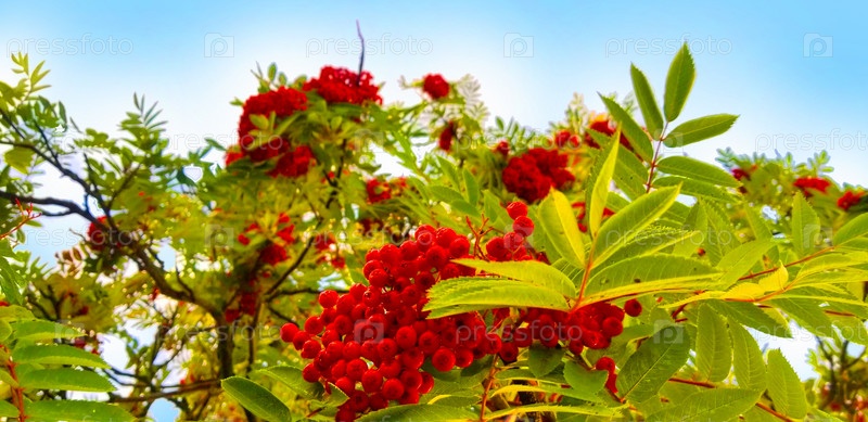 Пейзаж, небо, рябина спелая, красная