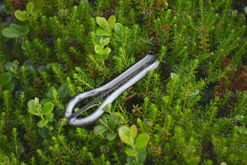Стальной варган на фоне зеленых веточек шикши