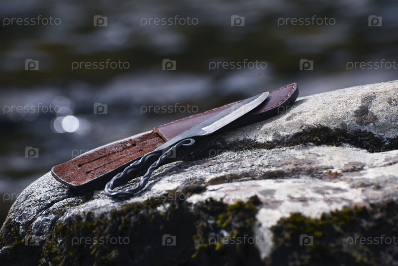 Кованый нож лежит на сером камне с ножнами