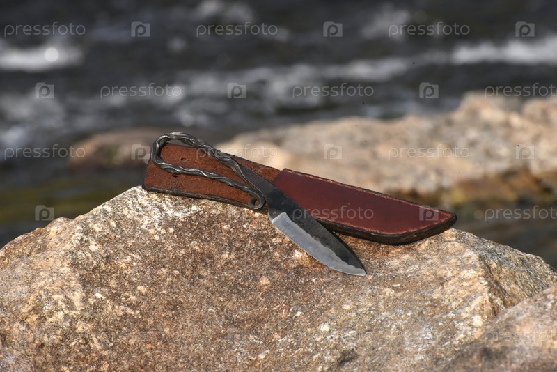Нож ручной работы вместе с ножнами из кожи на глыбе гранита на фоне реки