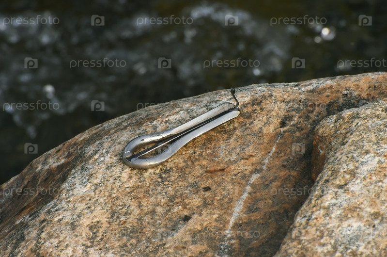 Стальной варган лежит на гранитном валуне на фоне бегущей воды