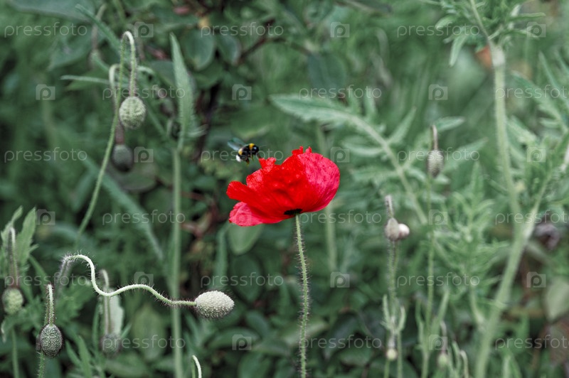Красный мак с пчелой в полете на зеленом фоне. Макрофотография