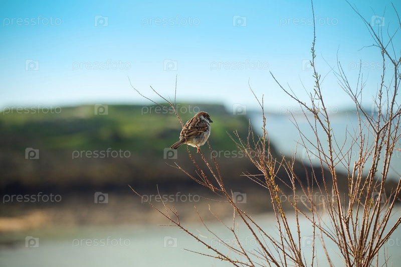 Воробей сидит на ветке на фоне моря и зеленого острова