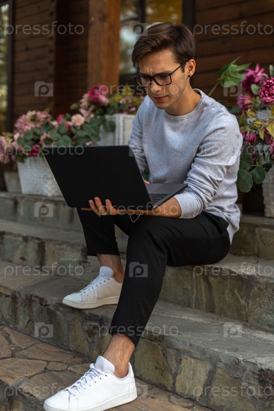 Студент работает за ноутбуком в парке