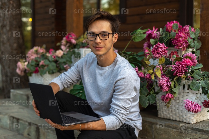 Студент работает за ноутбуком в парке