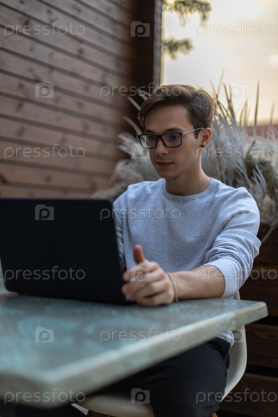 Студент работает за ноутбуком в парке