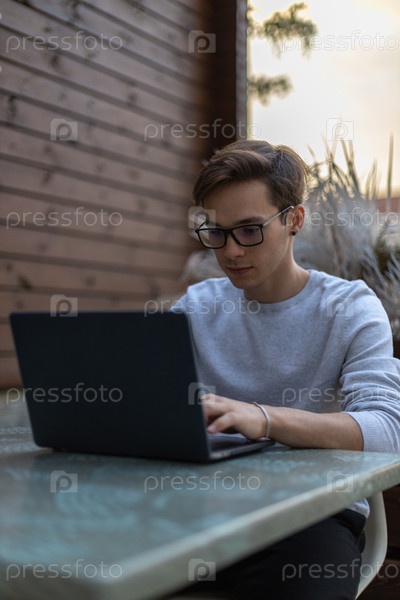 Студент работает за ноутбуком в парке